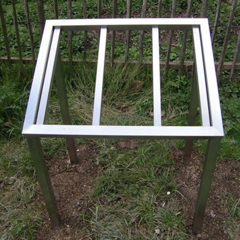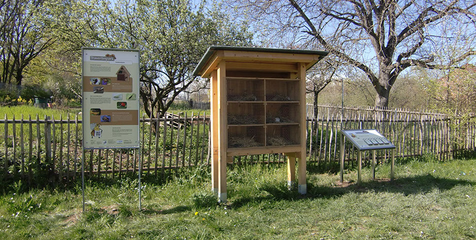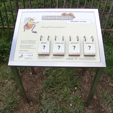 Erstellen und Aufbau einer interaktiven Lehrtafel bestehend aus einem Pultgestell aus Edelstahl (oben links). Produktion einer pass-genauen Grundtafel mit Klapptafeln und Halterungen aus Edelstahl. Zusammenbau vor Ort (oben rechts). Gesamtübersicht über den Lehrpfad (unten).